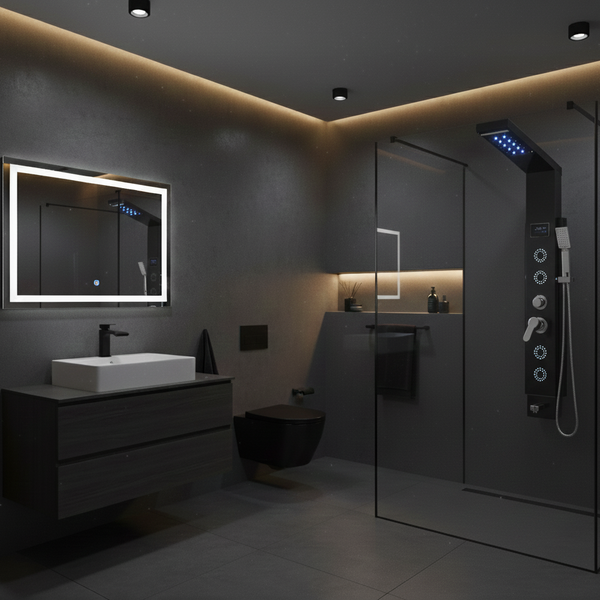 De afwerking bepaalt de finesse van het geheel. Mat zwart geeft meer karakter en werkt goed in moderne ruimtes. Glanzend chroom reflecteert licht en laat de badkamer helderder ogen. Staal oogt tijdloos en voelt stevig. Lelux synthetische materialen die mooi blijven en hun kwaliteit tonen bij dagelijks gebruik zodat jouw douchesysteem altijd zijn uitstraling versterkt.